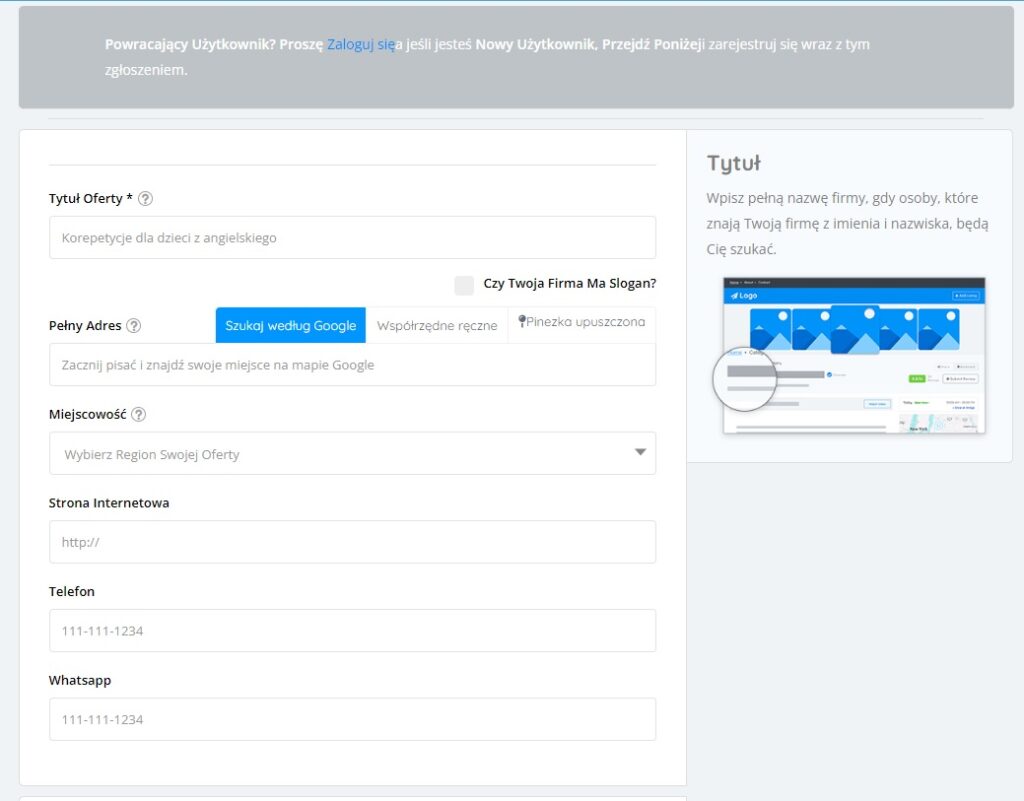 Dodawanie oferty do serwisu