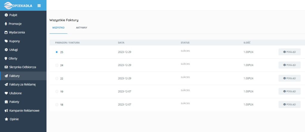 Tu po każdej płatności pojawią się twoje faktury, które możesz przeglądać jak i wydrukować je.